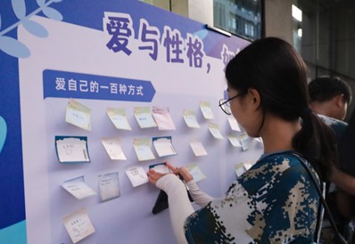 在“爱自己的一百种方式”展板前,员工们逐一将自己心目中的“爱自己的一百种方式”书写在便利贴上。环境科学与工程类专业2024级(2)班的程子越经过一番思考后,提笔写下了“常常旅行”四个字。“高中时期因为学业压力大,没有时间去旅行。上大学后,我希望弥补过去的遗憾,这对我来说也是一种爱自己的方式。”她分享。