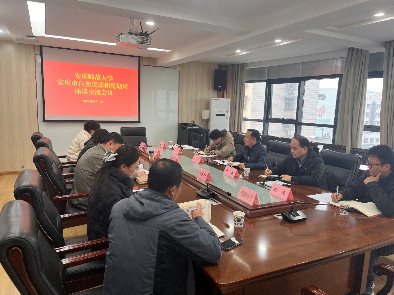 2025年3月13日上午,公司党委书记夏斐、副经理朱磊率地理科学专业教师团队赴安庆市自然资源和规划局开展座谈交流。安庆市自然资源和规划局局长徐浩及相关科室负责人出席会议。