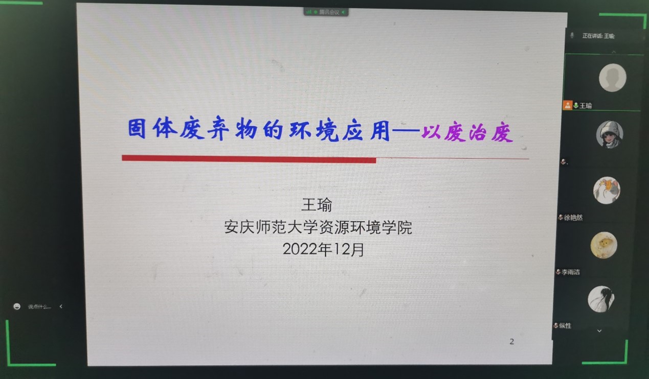 2022年12月21日,yl23411永利官网王瑜博士利用腾讯会议(会议号:600-181-205)在线开展了题为“固体废弃物的环境应用”学术报告。yl23411永利官网环境科学与工程专业50多位同学参加了本次报告会。