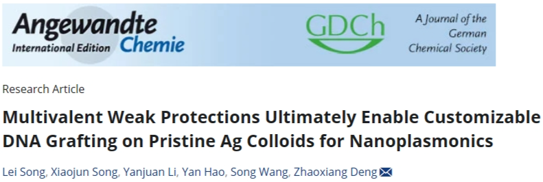 近日,yl23411永利官网教师宋磊在国际TOP期刊《Angewandte Chemie International Edition》(中科院SCI一区TOP期刊)发表题为“Multivalent Weak Protections Ultimately Enable Customizable DNA Grafting on Pristine Ag Colloids for Nanoplasmonics”的研究成果。《Angewandte Chemie International Edition》是国际化学领域最具影响力的顶级学术期刊之一,在全球化学界享有极高的声誉,影响因子为16.1。据悉,这是公司首次在该刊物发表学术研究论文。