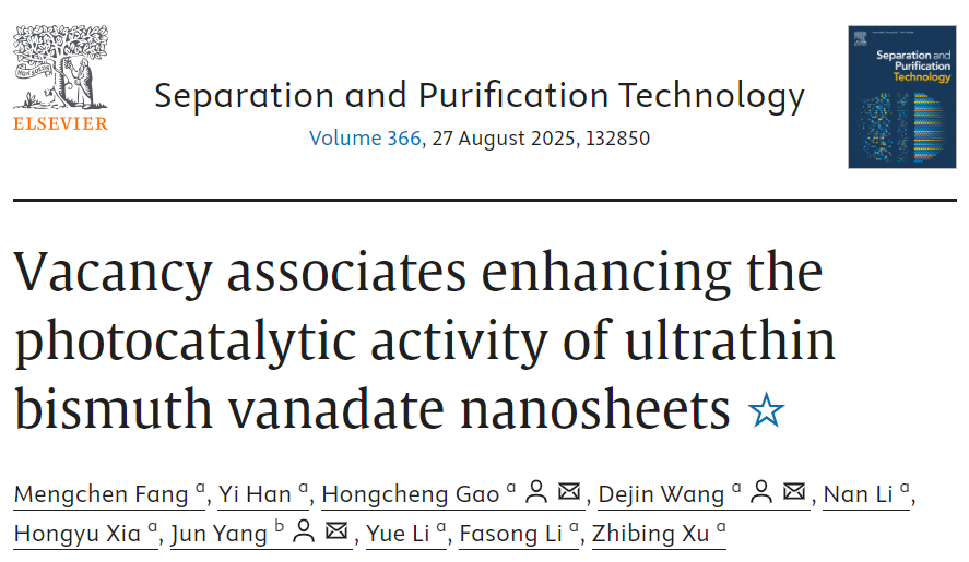 近日,yl23411永利官网环保高端装备与污染控制研究团队2023级研究生方梦晨以第一作者在中科院二区TOP期刊《Separation and Purification Technology》发表 “Vacancy Associates Enhancing the Photocatalytic Activity of Ultrathin Bismuth Vanadate Nanosheets”研究论文,yl23411永利官网为论文第一完成单位和通讯单位。论文指导老师和通讯作者为高洪成副教授和汪德进教授。
