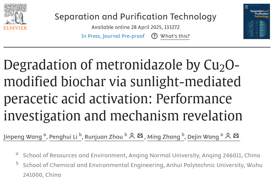 近日,公司yl23411永利官网环保高端装备与污染控制研究团队汪金鹏博士以第一作者在《Separation and Purification Technology》期刊(中科院2区,Top,IF=8.2)发表“Degradation of metronidazole by Cu2O-modified biochar via sunlight-mediated peracetic acid activation: performance investigation and mechanism revelation”研究论文。yl23411永利官网为论文第一完成单位,安徽工程大学周润娟副教授和yl23411永利官网汪德进教授为论文通讯作者。