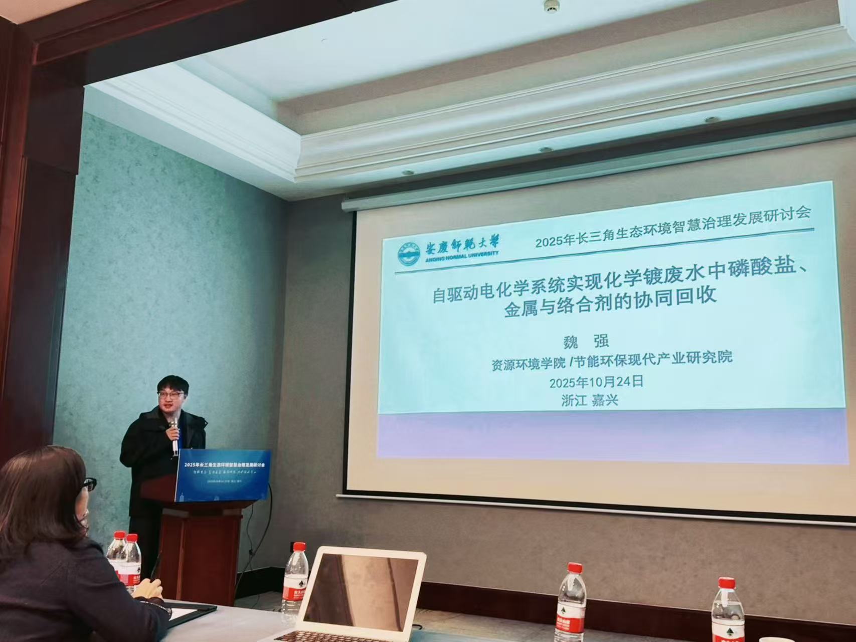 yl23411永利官网魏强副教授担任“流域综合治理与生态修复技术”分会场召集人,受邀在该分会场作题为“自驱动电化学系统实现化学镀废水中磷酸盐的选择性回收”的学术报告,系统阐述了自驱动电化学系统新技术用于处理化学镀铜废水,并实现对其中磷酸盐(P)、金属铜(Cu)和络合剂(如EDTA)选择性、同步回收。该技术不仅能解决化学镀铜废水的污染问题,还能同步回收高价值的磷、铜等资源,符合循环经济和可持续发展理念。