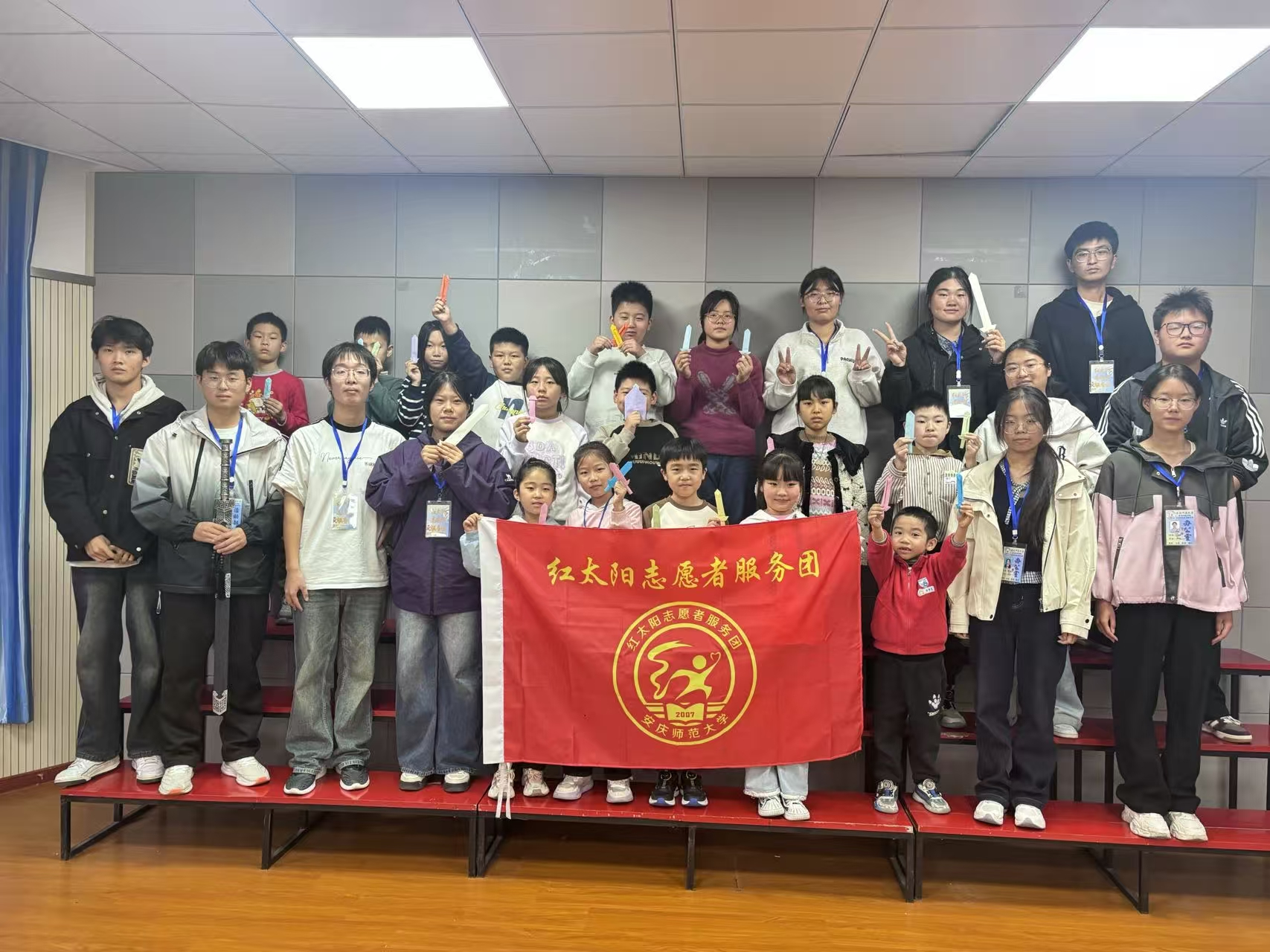 实践环节中,志愿者们手持提前准备的彩色卡纸,手把手指导孩子们折制纸剑。从卡纸对折、剑刃塑形到剑柄制作,志愿者耐心示范每一个步骤,对动手能力较弱的孩子俯身细致辅导。孩子们化身 “小小工匠”,指尖翻飞间,普通卡纸逐渐变为形态各异的 “宝剑”,部分同学还在剑柄绘制祥云花纹,融入个性创意。完成作品后,孩子们纷纷举起 “纸剑” 展示,脸上洋溢着成就感。