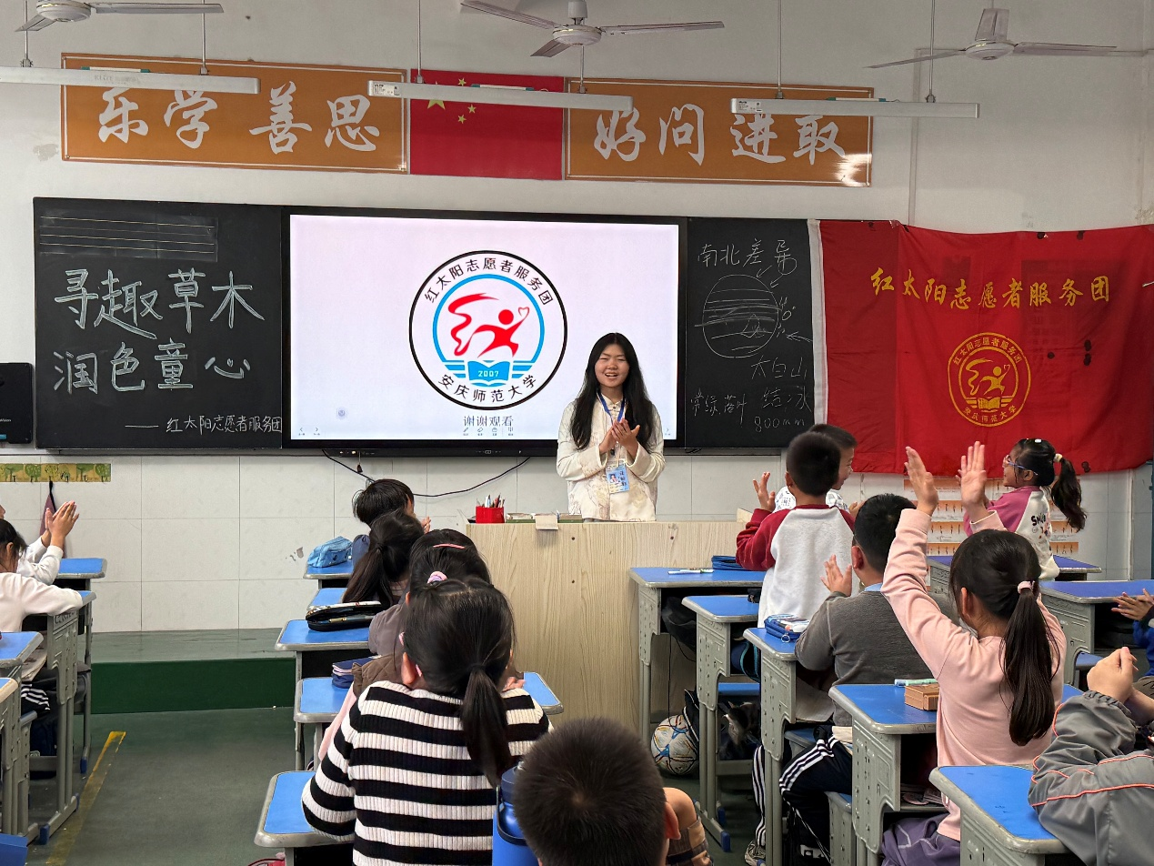 在理论课堂上,2025 级地理科学专业(3)班志愿者郭雨桐以叶片为切入点,通过实物展示、趣味比喻等方式开展教学。她引导孩子们用放大镜观察银杏叶脉络,以“植物公寓”喻解热带雨林垂直分层现象,结合香樟树、银杏树等典型样本,对比温带落叶林与亚热带常绿林叶片特征,阐释环境对植物形态、生态功能的影响,让孩子们直观理解南方植被适应高温多雨、北方植被应对寒冷干旱的生长智慧,激发探索自然的兴趣。